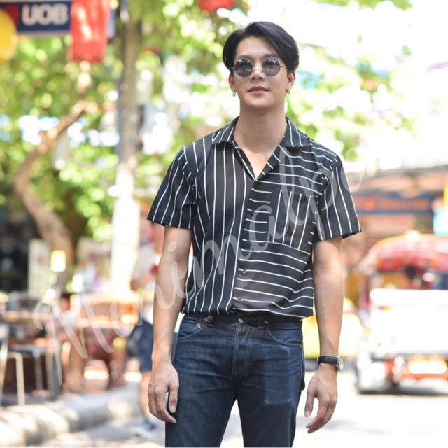 - - Minimal shirt เชิ้ตลายทาง สีดำ ราคาถูก